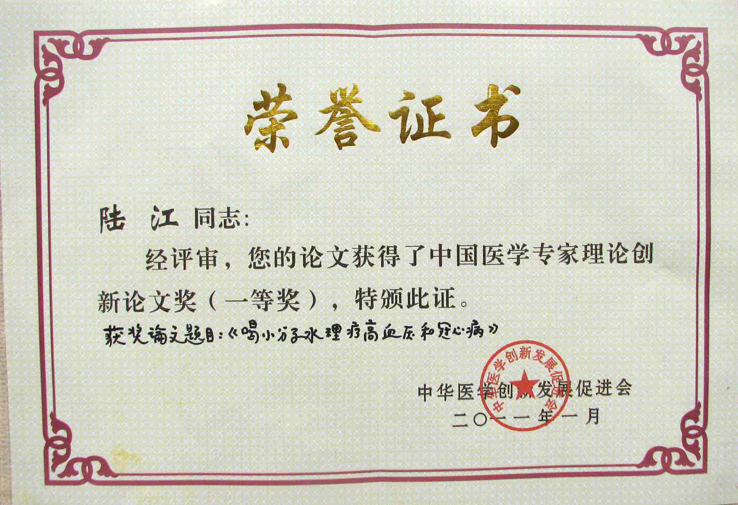新疆63歲的賀兆生飲用一年,冠心病未愈,他用電話介紹是食堂管理員,問他食量多少?說吃七八分飽,睡前還吃兩袋牛奶,陸 江說我在論文和書中多次批判“吃七八分飽”,關(guān)照患者務(wù)必用“己饑方食”控制主食肉食量,要他把牛奶改在早中餐吃,減少主食肉食量,建議不吃晩餐,晚上只吃一個(gè)蘋果,再經(jīng)幾個(gè)月補(bǔ)水節(jié)食,治愈了21年的冠心病和肥胖、失眠等病,信中由衷地感激陸 江為再生父母。[13]因?yàn)獒t(yī)生從未過問他的膳食習(xí)慣,只管開處方藥或手術(shù),父母也不會(huì)叫他不吃晩飯。