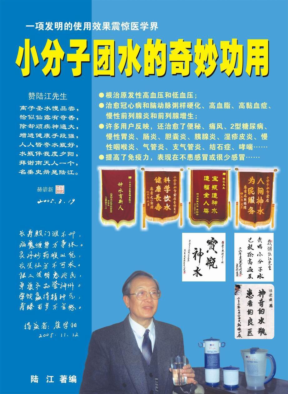 -----我是從事建筑的高工,本來沒有資格去攻克醫(yī)學(xué)難題,卻為了自身健康才扣響醫(yī)學(xué)的大門。由于我1990年患高血壓,因怕中風(fēng)才研究發(fā)明了離子水瓶,我把水處理成微小分子團(tuán)水,飲用后治愈了高血壓。便于1993年底送到三家省級醫(yī)院做臨床試用4個(gè)月。經(jīng)北京和廣西醫(yī)學(xué)專家鑒定:"降脂降壓效果好"," 能擴(kuò)大心腦動(dòng)脈流量,改善心腦電圖以及微循環(huán)","對治療心腦動(dòng)脈粥樣硬化、高血壓、高血脂有良好的醫(yī)療保健作用。""產(chǎn)品的技術(shù)性能和療效達(dá)到了同類產(chǎn)品的國內(nèi)領(lǐng)先水平,經(jīng)廣西醫(yī)學(xué)科學(xué)情報(bào)研究所檢索,未見國外有類似報(bào)道。"中國醫(yī)學(xué)科學(xué)院張正國教授從美國國立醫(yī)學(xué)圖書館數(shù)據(jù)庫存Medline檢索英俄文資料,均未見類似報(bào)告。2000年上市后,我為了對消費(fèi)者負(fù)責(zé)而繼續(xù)觀察研究,一直通過《信譽(yù)卡》和《質(zhì)量跟蹤調(diào)查書》向患者承諾療效,請用戶使用6個(gè)月后反饋效果。和脂壓患者飲用2至5個(gè)月內(nèi),消除癥狀,停服藥物,血壓正常;冠心病患者飲用3~5個(gè)月逐漸減輕至消除心絞痛、房顫等癥狀,不再服藥,飲用1年左右心電圖正常,經(jīng)冠脈造影掃描無明顯狹窄,表明冠心病痊愈。大量患者還反映許多衰弱器官被修復(fù),讓前列腺增生、慢性咽喉炎、慢性氣管炎、支氣管炎、慢性胃炎、腸炎和膽囊炎等不藥而愈;2型糖尿病患者是因?yàn)橐葝u衰弱致病,飲用該水半年至一年,逐漸減藥至停藥,血糖尿糖正常,真正治愈2型糖尿病。中風(fēng)后遺癥患者飲用六七個(gè)月,可逐漸減輕至消除肢體和語言障礙,表明飲用該水能讓壽命很長的神經(jīng)元細(xì)胞逐漸修復(fù),奇跡般地恢復(fù)肢體和語言功能。飲用后還使胸腺和脾臟兩個(gè)重要的免疫器官被修復(fù)和增強(qiáng),產(chǎn)生免疫細(xì)胞多,提高了免疫力,使人不生病或少生病。自此, 飲用微小分子團(tuán)水創(chuàng)造了攻克冠心病、高(低)血壓和糖尿病三大醫(yī)學(xué)難題的奇跡。人們對此感到不可思議,但實(shí)踐是檢驗(yàn)真理的唯一標(biāo)準(zhǔn)。